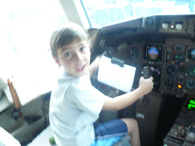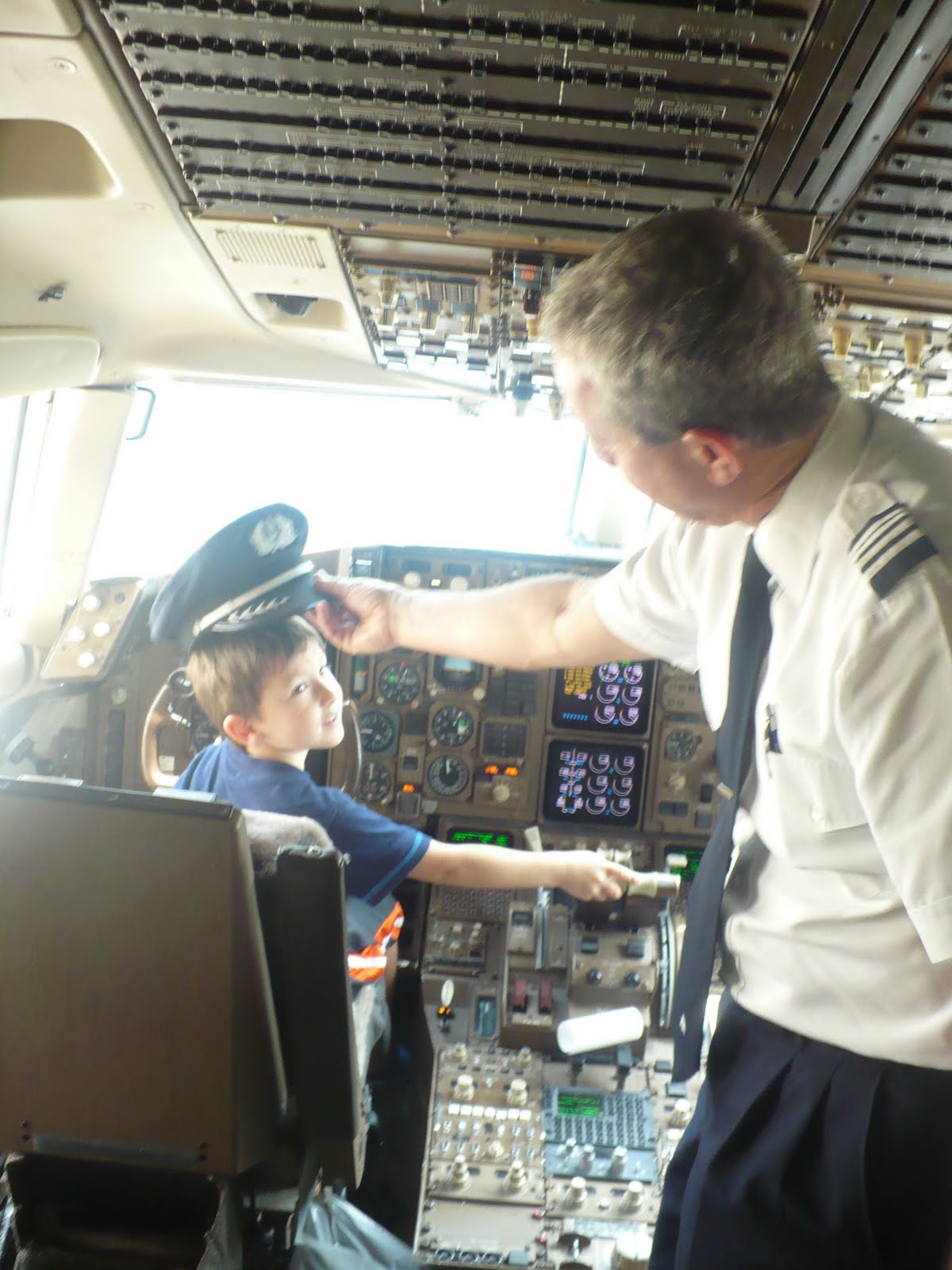| And Evan visited the captain of the next plane up front too! Evan said, “I’ve got to do this before but this is the first time I got to wear the hat!” |