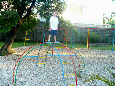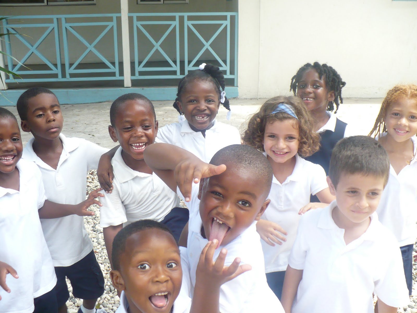 | The boys ready for school on Monday morning (the morning after arriving in Haiti the night before) watching a group of kids playing red light green light before school. |