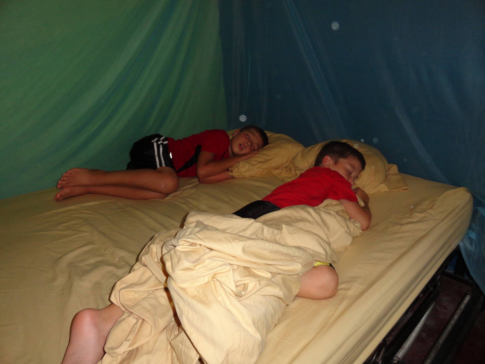 | Sleeping in my bed. It was very hot. But we were very tired. -Ethan |